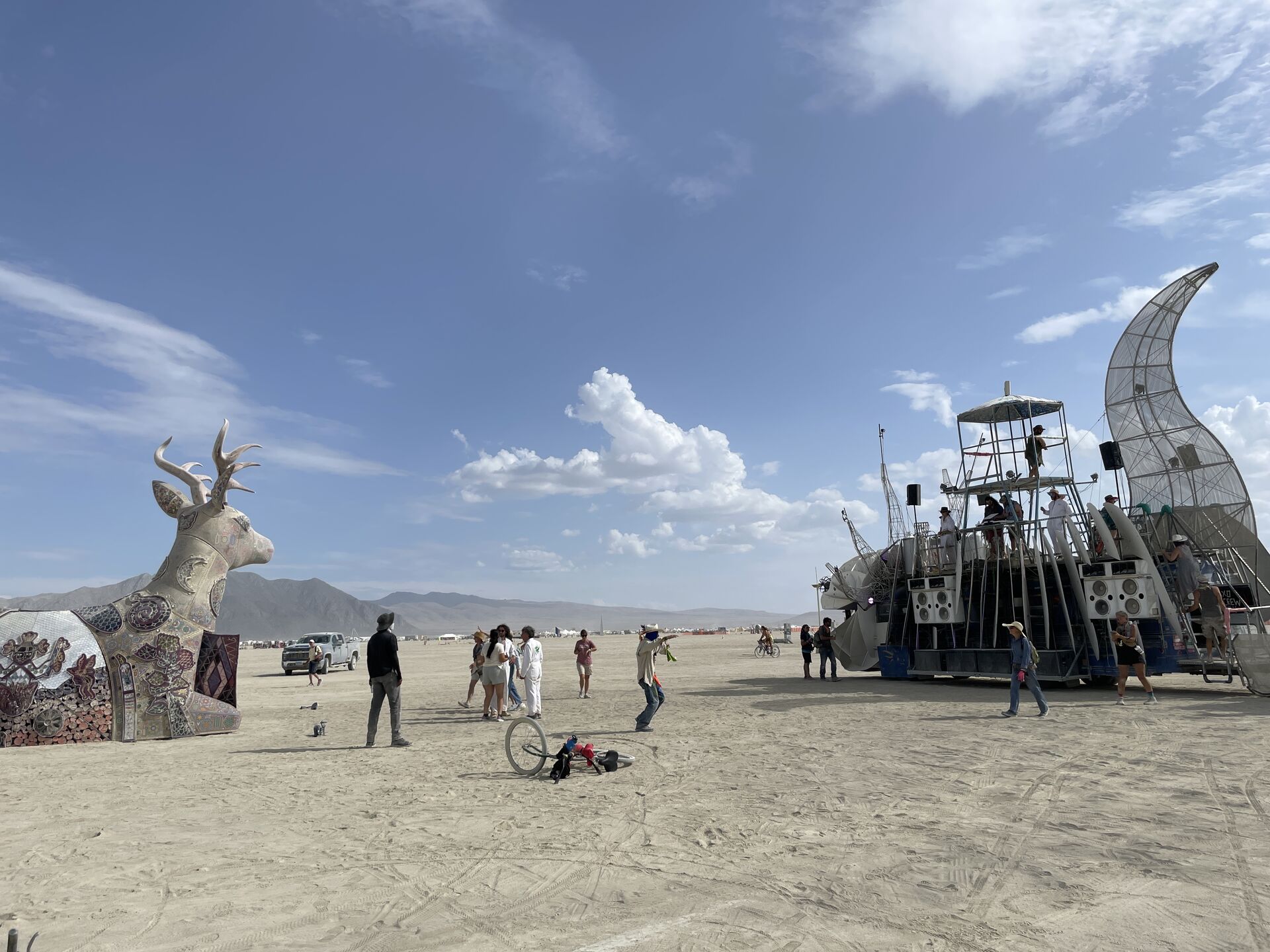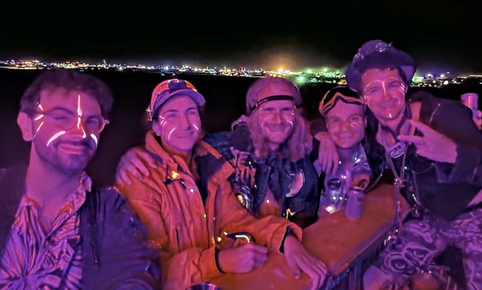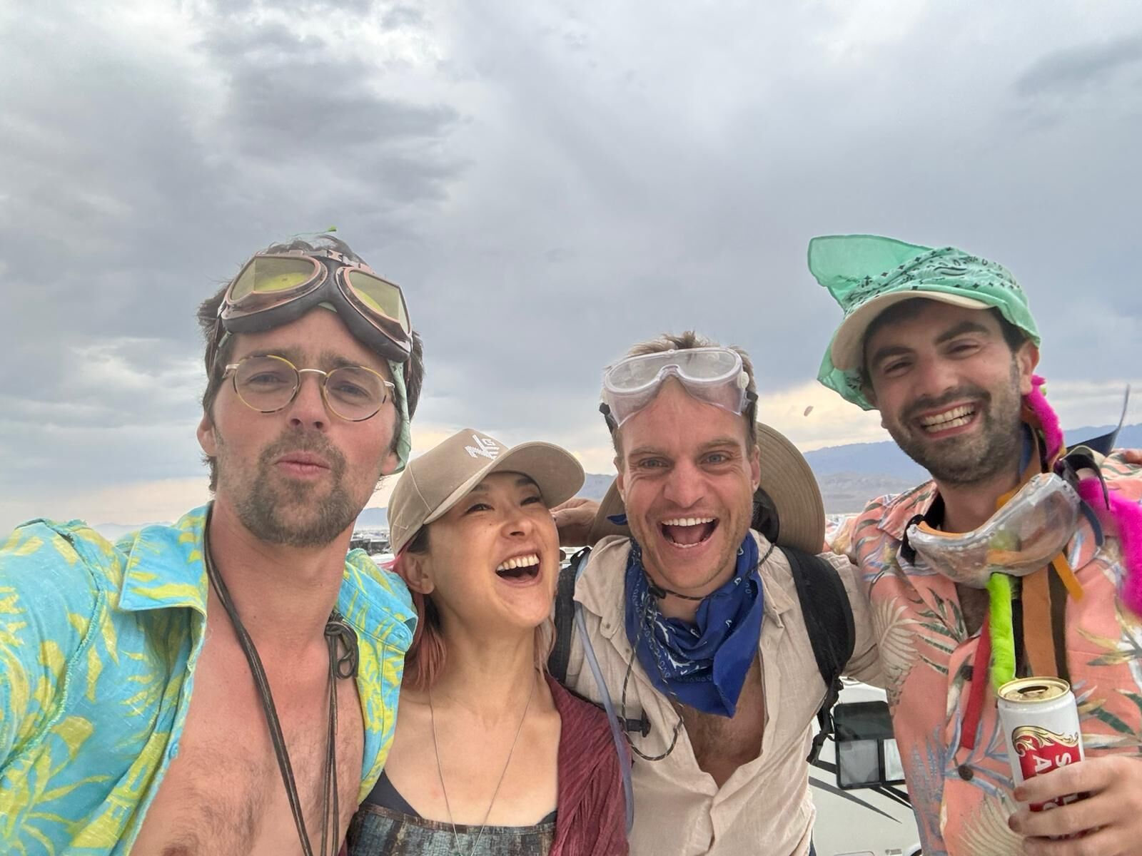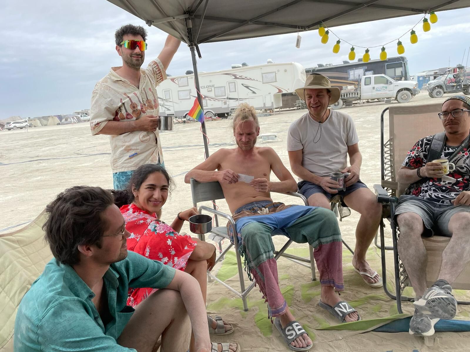 Our camp is filling up, and it's sometimes a bit overwhelming to meet so many people, but of course, everything has to settle in, and everyone needs time to find their place in the camp. Four people from Bordeaux, my age, are coming: Etienne, Antoine, Rada, and Dennis. We hit it off right away, and every evening around 9 p.m., we group up and go on an adventure across the "playa," or beach, the heart of Burning Man, where parties are happening on every street. Some parties are on permanent stages, but sometimes enormous converted trucks drive by with music and lights, which you can stand on and dance on, and often even climb into. Etienne and Antoine, in particular, are real partygoers. We click so well that we know we can rely on each other without exchanging too many words. When it's so good, it can easily get light while you're still at the party. At 7 a.m., as the sun rises, the crowd deep in the beach only increases as people just waking up arrive. It's so unique because everyone is in the same boat, having been there for a week with barely any Wi-Fi, that you truly feel connected. No one has to go to work or get an important message. Everyone is completely focused on the party, and that's quite special today, with all the electronics.