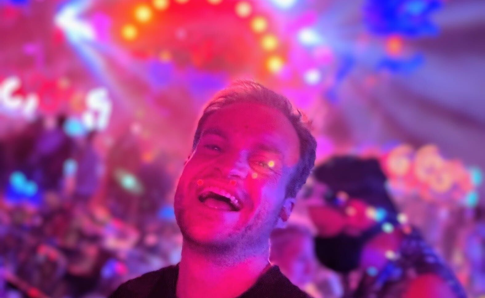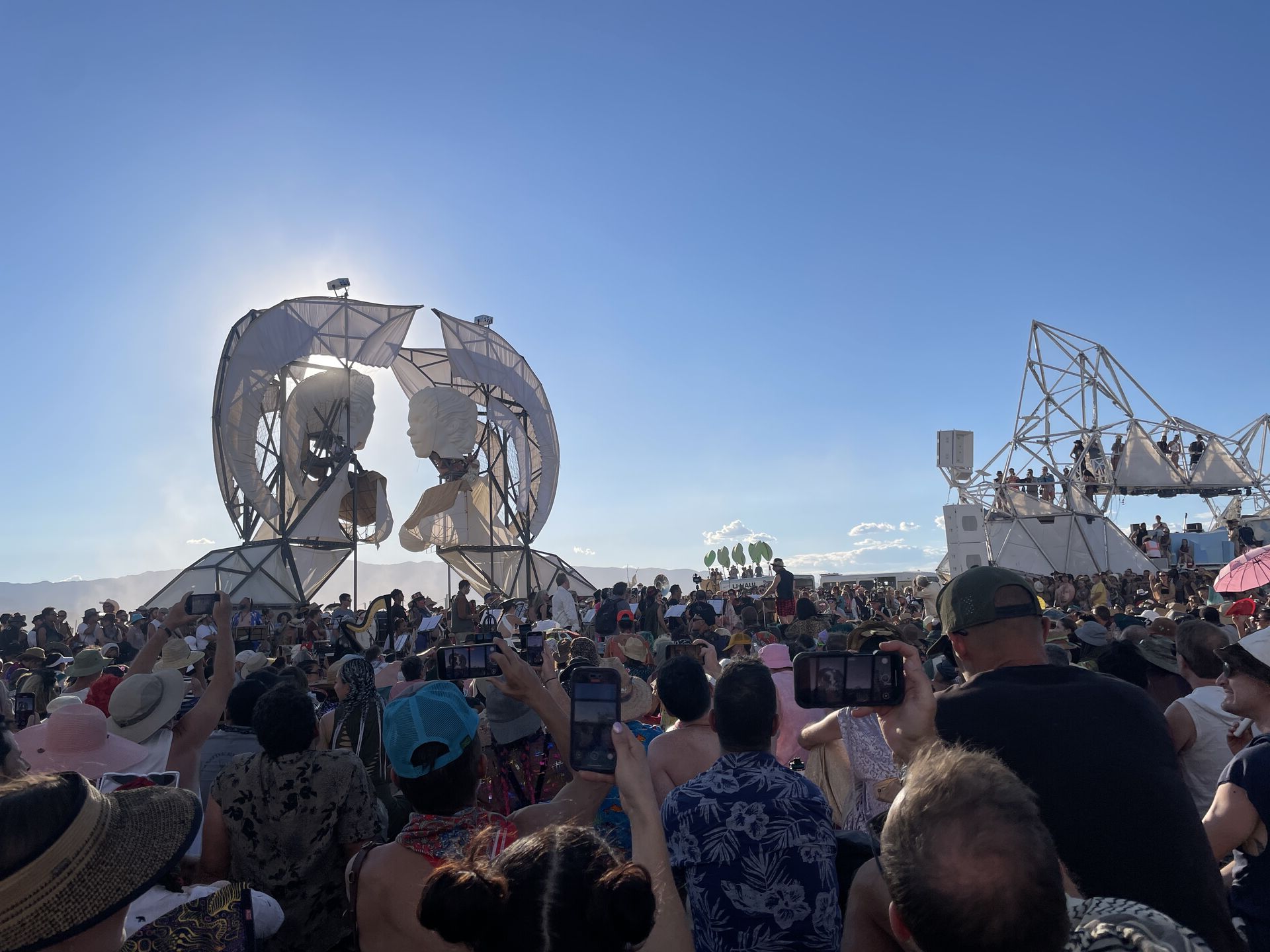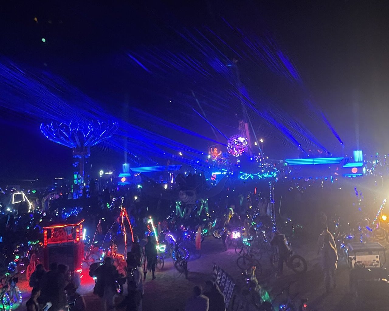 Our camp is filling up, and it's sometimes a bit overwhelming to meet so many people, but of course, everything has to settle in, and everyone needs time to find their place in the camp. Four people from Bordeaux, my age, are coming: Etienne, Antoine, Rada, and Dennis. We hit it off right away, and every evening around 9 p.m., we group up and go on an adventure across the "playa," or beach, the heart of Burning Man, where parties are happening on every street. Some parties are on permanent stages, but sometimes enormous converted trucks drive by with music and lights, which you can stand on and dance on, and often even climb into. Etienne and Antoine, in particular, are real partygoers. We click so well that we know we can rely on each other without exchanging too many words. When it's so good, it can easily get light while you're still at the party. At 7 a.m., as the sun rises, the crowd deep in the beach only increases as people just waking up arrive. It's so unique because everyone is in the same boat, having been there for a week with barely any Wi-Fi, that you truly feel connected. No one has to go to work or get an important message. Everyone is completely focused on the party, and that's quite special today, with all the electronics.