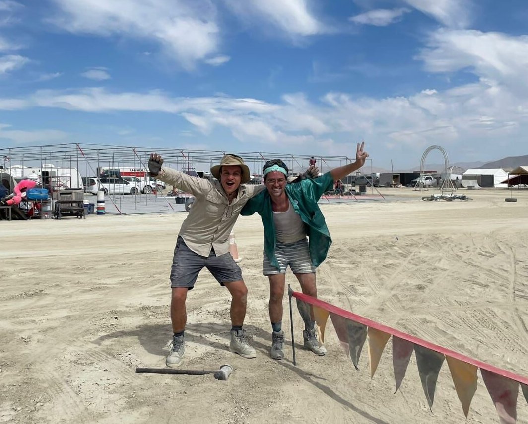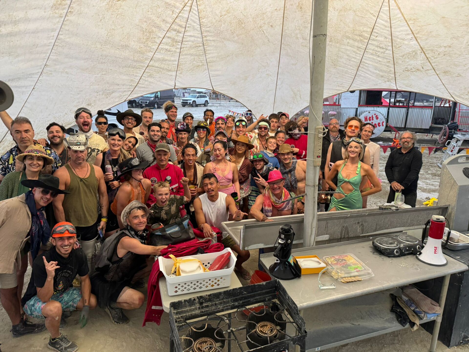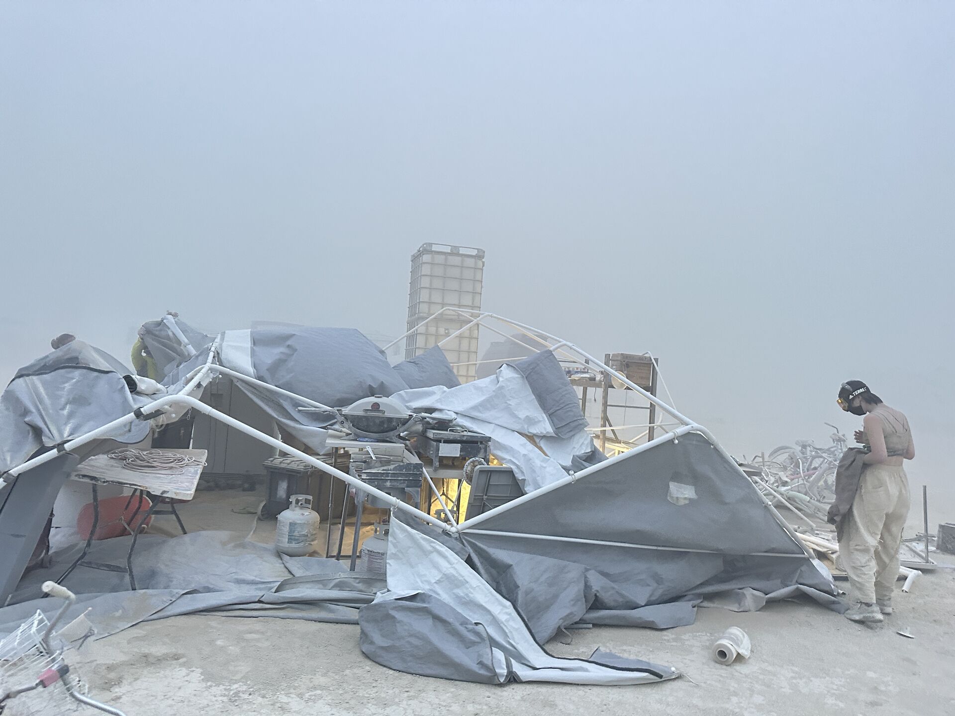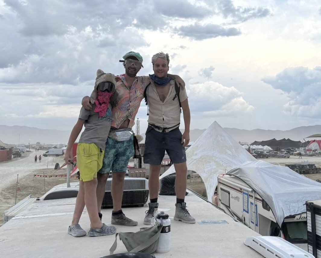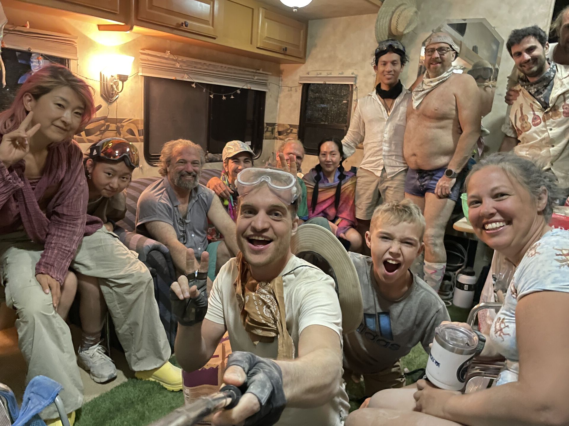 We're nearing the end of the set-up; we've worked hard and, of course, we've also had a party. I walk to our kitchen tent where the children, Eden and Lio, are, and a mother and daughter from China who are making dumplings, when suddenly a huge cloud of dust rises, and we're caught in a massive sandstorm. Everyone rushes to the corners of the tent, trying with all their might to keep it from blowing away, but after a few minutes it becomes clear that the tent isn't that important at all. This sandstorm is so powerful that we don't fear for our kitchen tent, but mainly for our own lives. Eden doesn't have a face mask, so I give him mine and warn the boys to take shelter behind the refrigerators. The wind keeps picking up, and the entire frame starts to break off, and the roof blows in all directions. The Chinese mother and daughter on the other side of our tent are out of sight. Even two meters ahead, you have no idea what's happening because of all the drifting sand. Eden heroically crawls across the floor, retrieves the Chinese women, and the five of us huddle against the refrigerators for a full two hours. It's an insane experience; it's my first Burning Man, but I quickly realize that what we're experiencing here isn't normal, not even at Burning Man. After two hours, it's not over yet, but luckily our camp leader arrives and accompanies us to their RV. We're covered in a few inches of sand. But once again, the feeling of community prevails. There are 16 of us in an RV, with drinks, snacks, and music, and we talk about this bizarre event.
