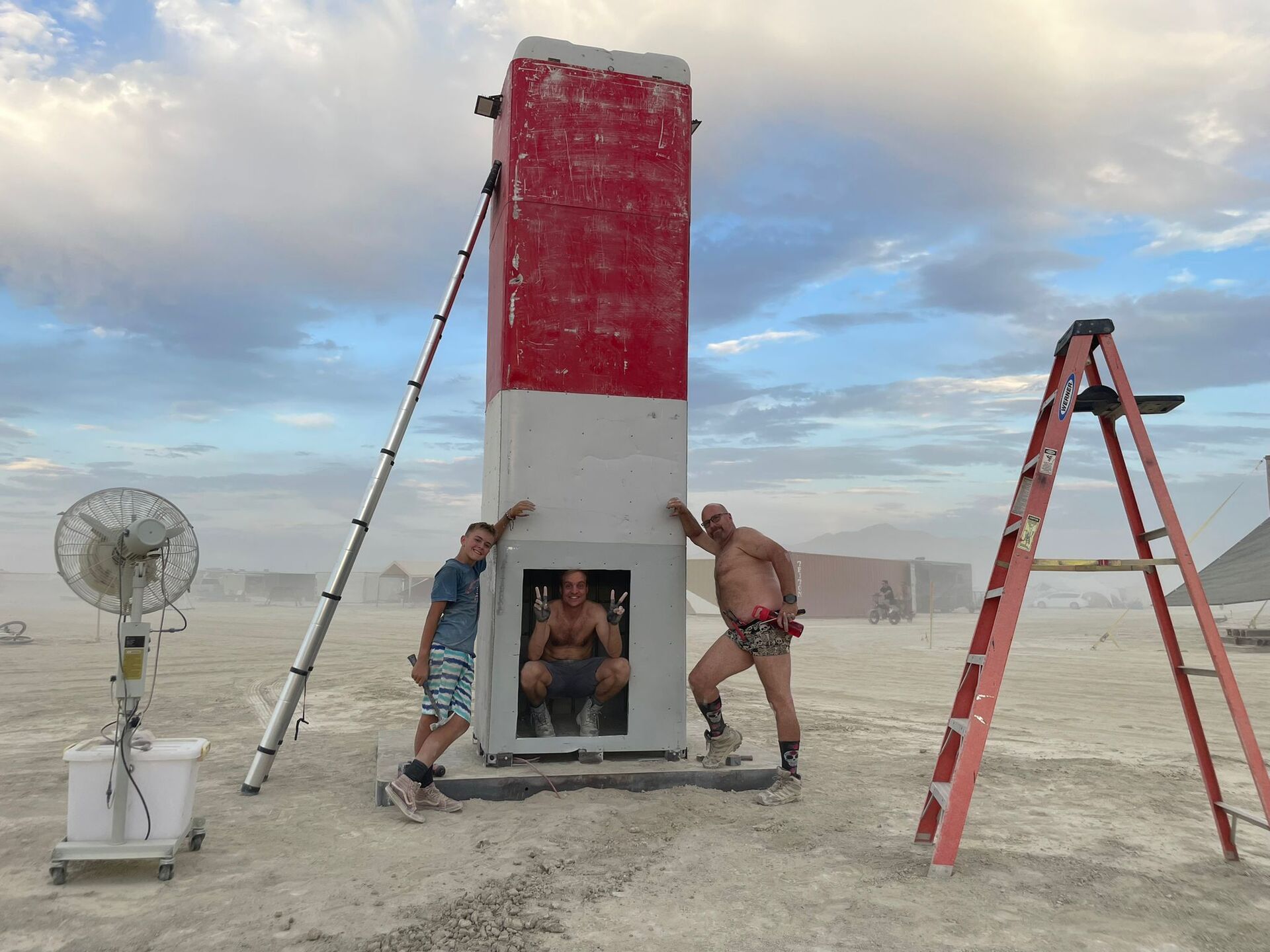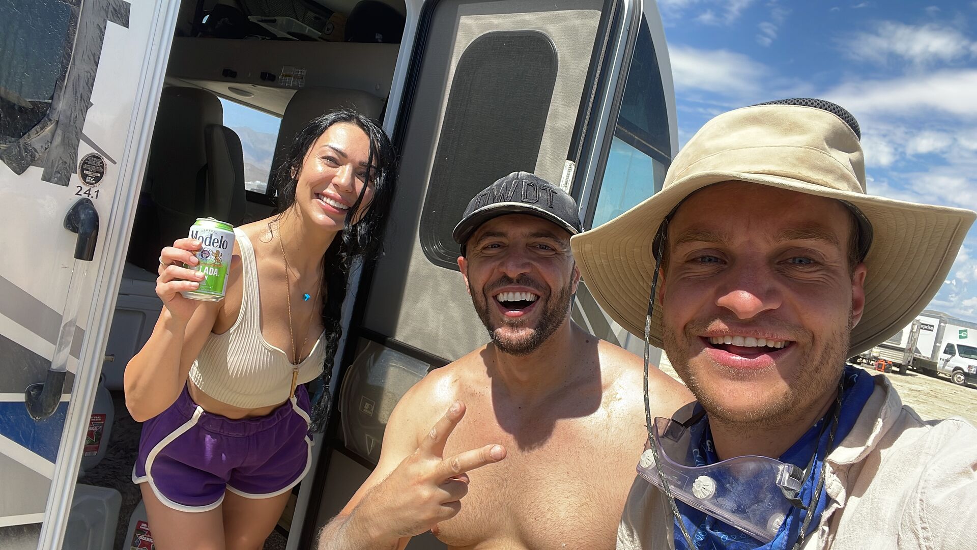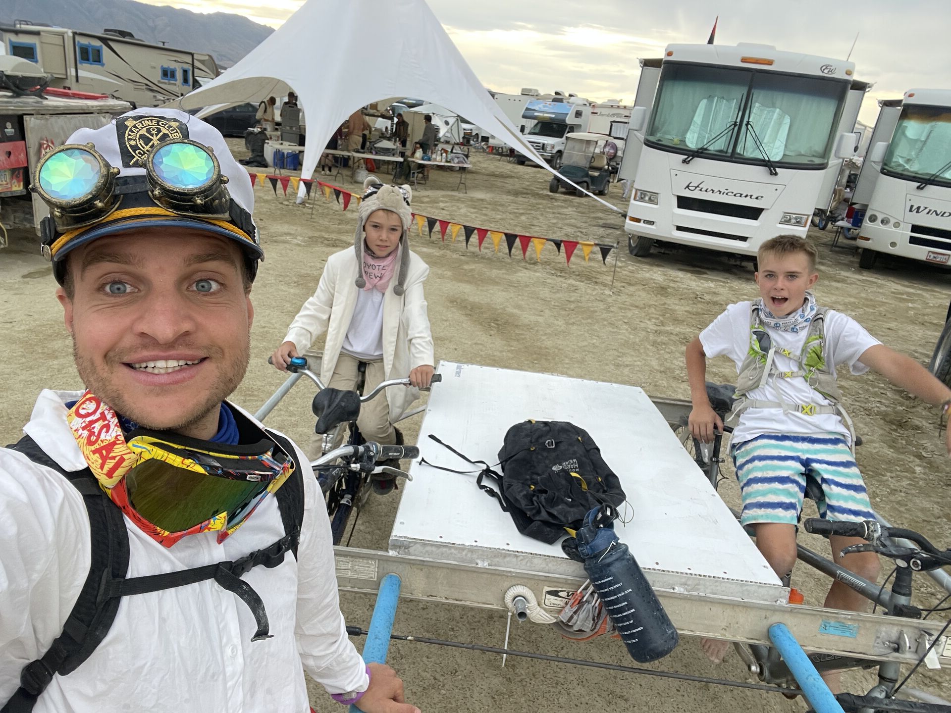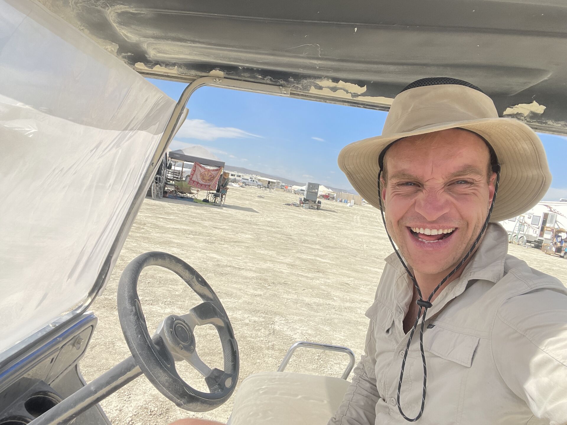 We're nearing the end of the set-up; we've worked hard and, of course, we've also had a party. I walk to our kitchen tent where the children, Eden and Lio, are, and a mother and daughter from China who are making dumplings, when suddenly a huge cloud of dust rises, and we're caught in a massive sandstorm. Everyone rushes to the corners of the tent, trying with all their might to keep it from blowing away, but after a few minutes it becomes clear that the tent isn't that important at all. This sandstorm is so powerful that we don't fear for our kitchen tent, but mainly for our own lives. Eden doesn't have a face mask, so I give him mine and warn the boys to take shelter behind the refrigerators. The wind keeps picking up, and the entire frame starts to break off, and the roof blows in all directions. The Chinese mother and daughter on the other side of our tent are out of sight. Even two meters ahead, you have no idea what's happening because of all the drifting sand. Eden heroically crawls across the floor, retrieves the Chinese women, and the five of us huddle against the refrigerators for a full two hours. It's an insane experience; it's my first Burning Man, but I quickly realize that what we're experiencing here isn't normal, not even at Burning Man. After two hours, it's not over yet, but luckily our camp leader arrives and accompanies us to their RV. We're covered in a few inches of sand. But once again, the feeling of community prevails. There are 16 of us in an RV, with drinks, snacks, and music, and we talk about this bizarre event.