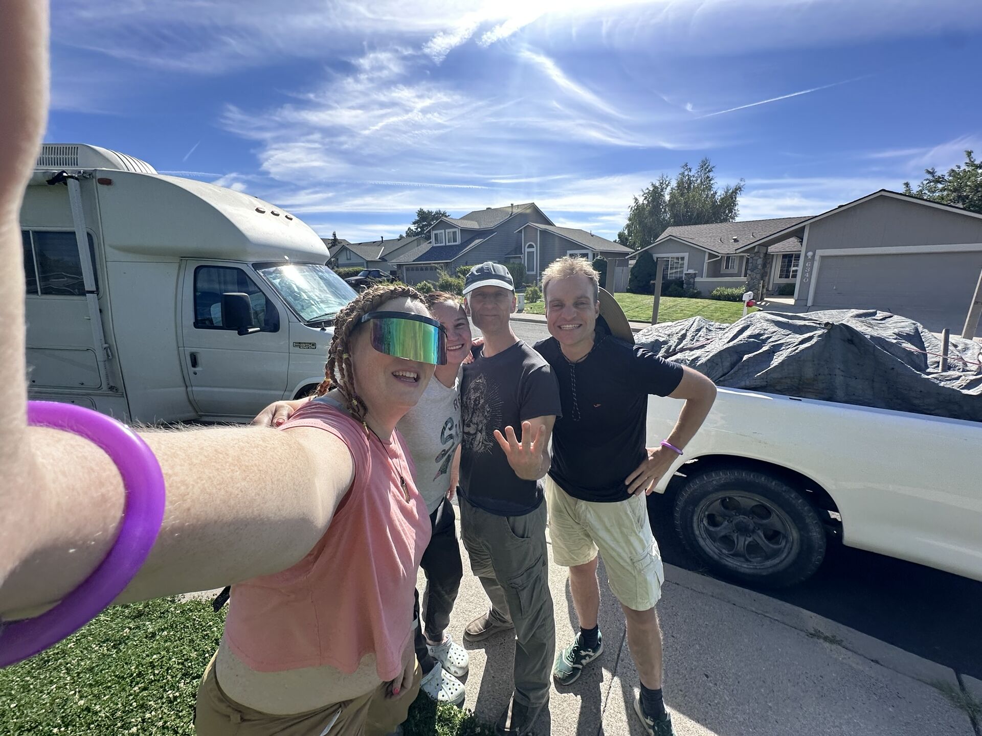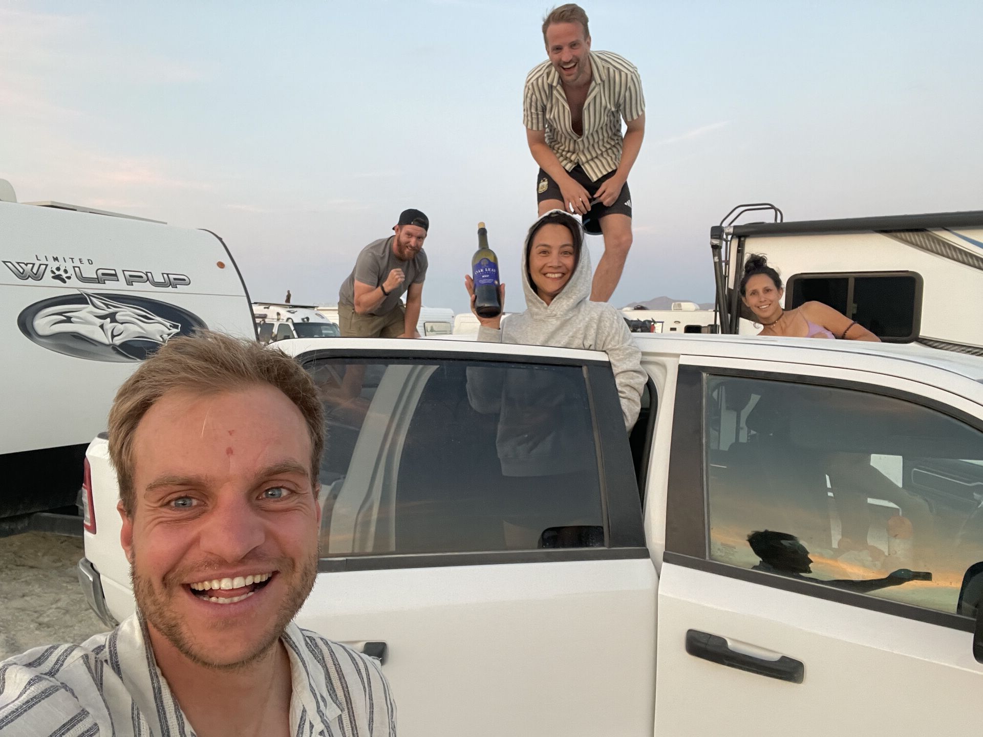 Suddenly, a redeeming message arrived on Facebook. A certain Masha messaged me that I could ride with her, along with Calamity and another guy. So, when I got the green light, I went to Walmart twice that same day to check off my entire grocery list, stopped by Playapad to pick up camping gear, and went to the Airbnb to fill jerry cans with water. It all just barely fit, but luckily by 5 p.m. I had everything ready and was picked up by a large truck. We drove to their house in Reno with people I didn't know at all, and who weren't from my camp either. The two girls were camp organizers from another camp. We were able to stay overnight at their house in Reno and leave early the next day for Burning Man. Until that moment, I'd been so nervous about everything that had to be arranged, but now that all the gear and even the transportation were taken care of, I could let go of my worries for the first time and enjoy a good old-fashioned cold beer. Because isn't that phenomenal? That people who don't know you at all take you into their homes and even bring you to Burning Man? And moreover, that you can connect so spontaneously with people, even though everyone has a completely different story, and yet you get to experience the journey together.