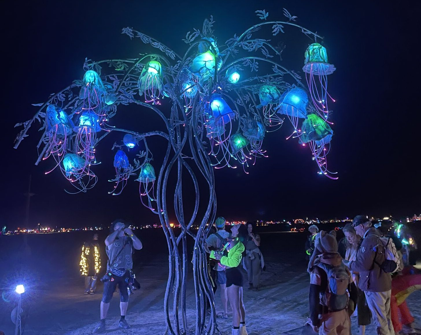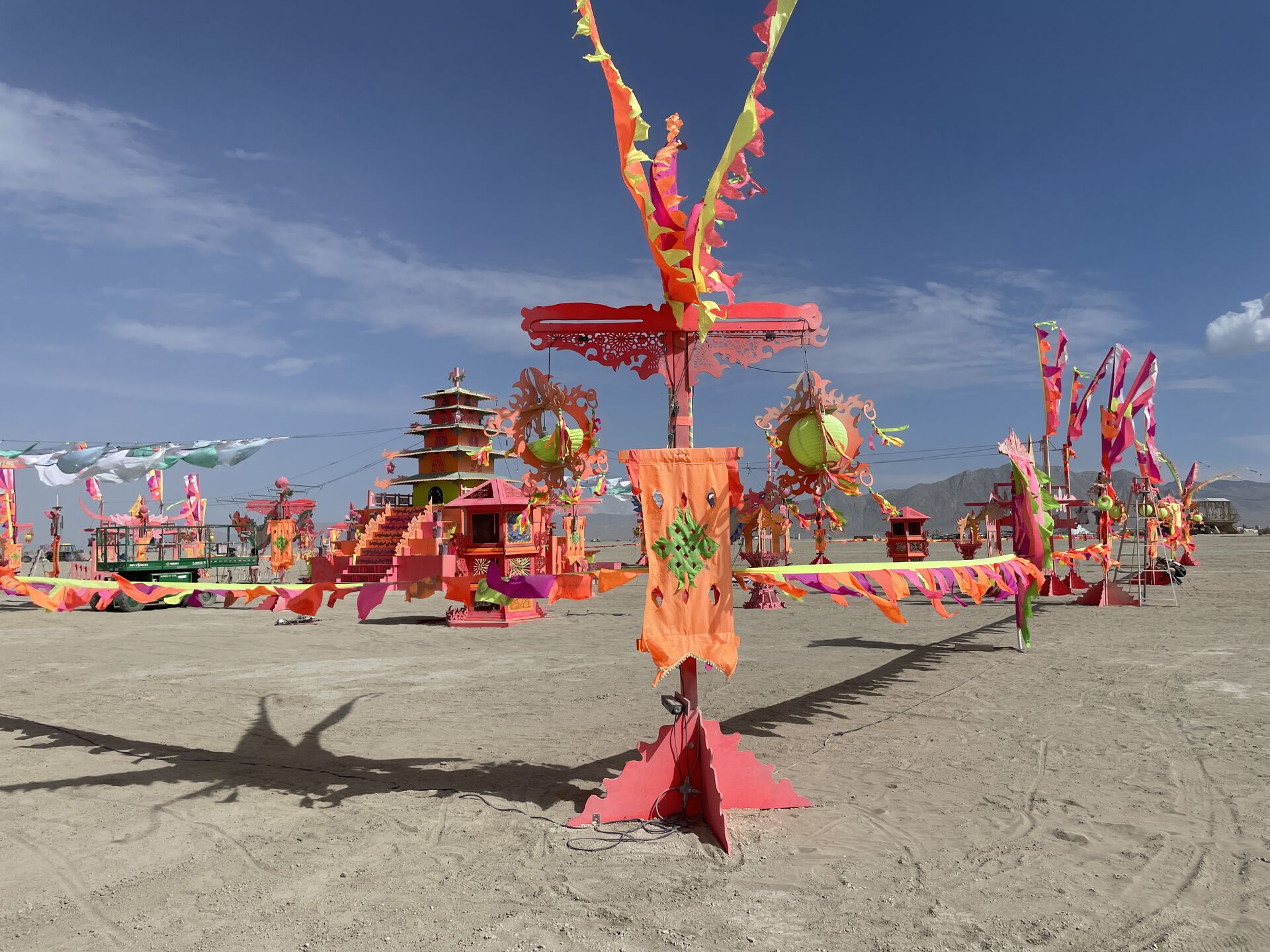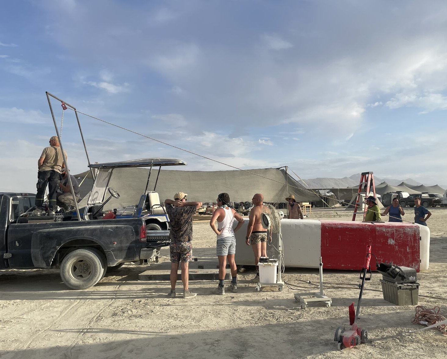 It's not all fun and games, though; there are also tasks to be done at camp. As "El Station," we offer passersby a refreshment station. We have a replica gas station where people get a refreshing spray of water vapor with an air shower and water with electrolytes. Potstickers, a kind of dumpling, are also served from the art car, for which people line up all the way down the street. In the mornings, you sleep in, usually chat with a group, and then get ready for the day. A walk to the restroom, because peeing on the beach is a no-go. Fill up your water, remove sand from your tent, and organize your camelback bag. Sunscreen, water, light.