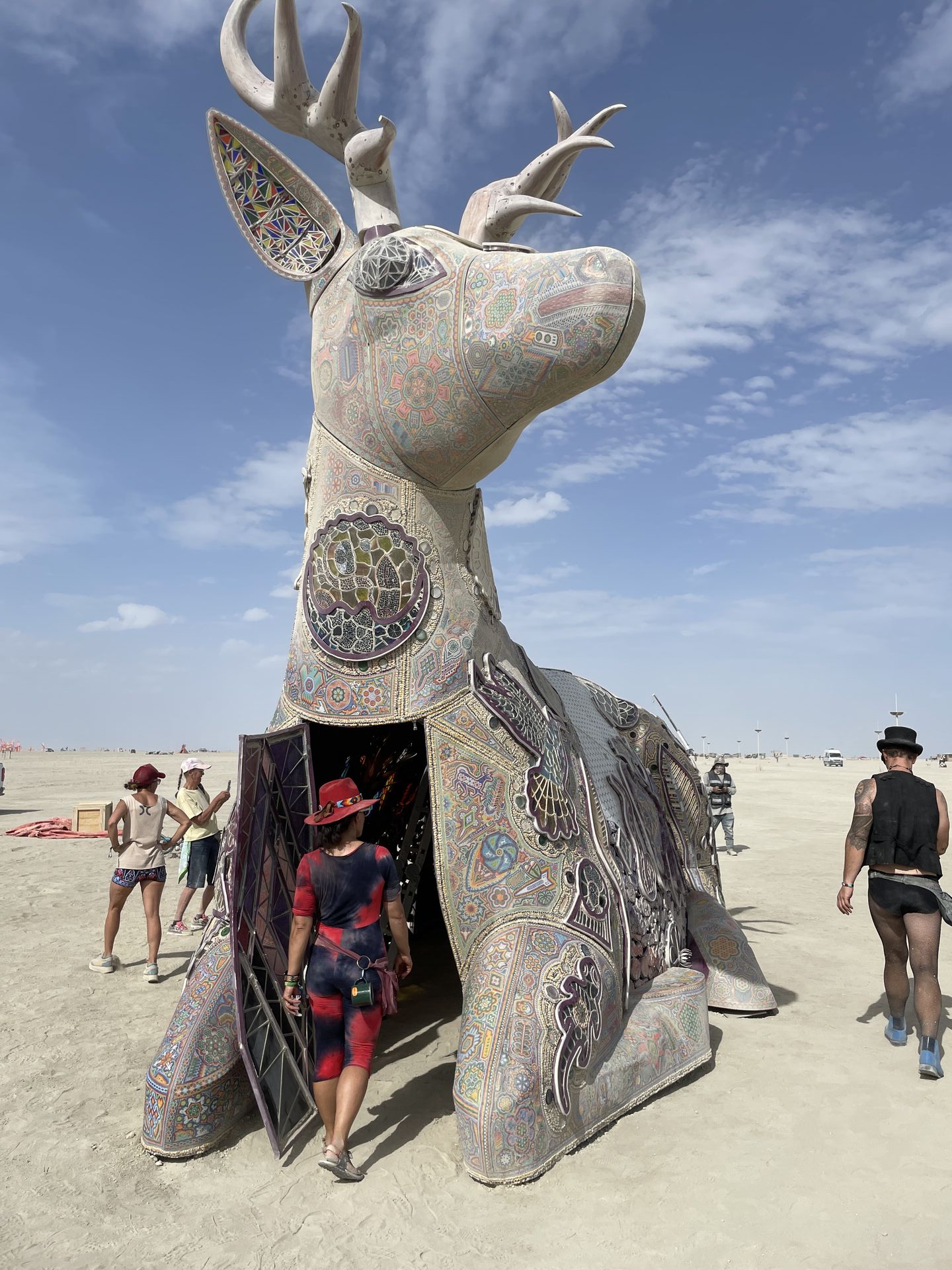 Burning Man started in Los Angeles in the 1980s, when a group of hippies decided to burn a wooden man on Baker Beach. Since 1990, it has moved to the desert and has grown into the immense city it is today in the middle of the desert. Upon arrival, we are greeted by "the greeters," and traditionally, new burners have to make a sand angel by lying in the sand and moving their arms and legs. I see the city under construction and cars with enormous clouds of sand. Already in line, we see frenzied people dancing on the roofs. A muscular man dancing naked on top of his car with a horn from which he drinks. The people are so incredibly friendly. It takes me a little while to get used to it, because it's apparently quite customary here to hug a complete stranger. "Welcome home!" is what the groups say. While everything seems to be possible, I notice there's one thing people don't really appreciate here: calling Burning Man a festival.