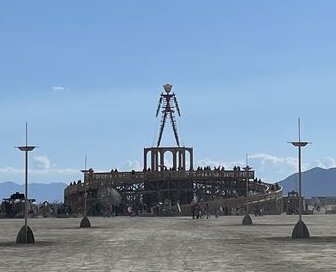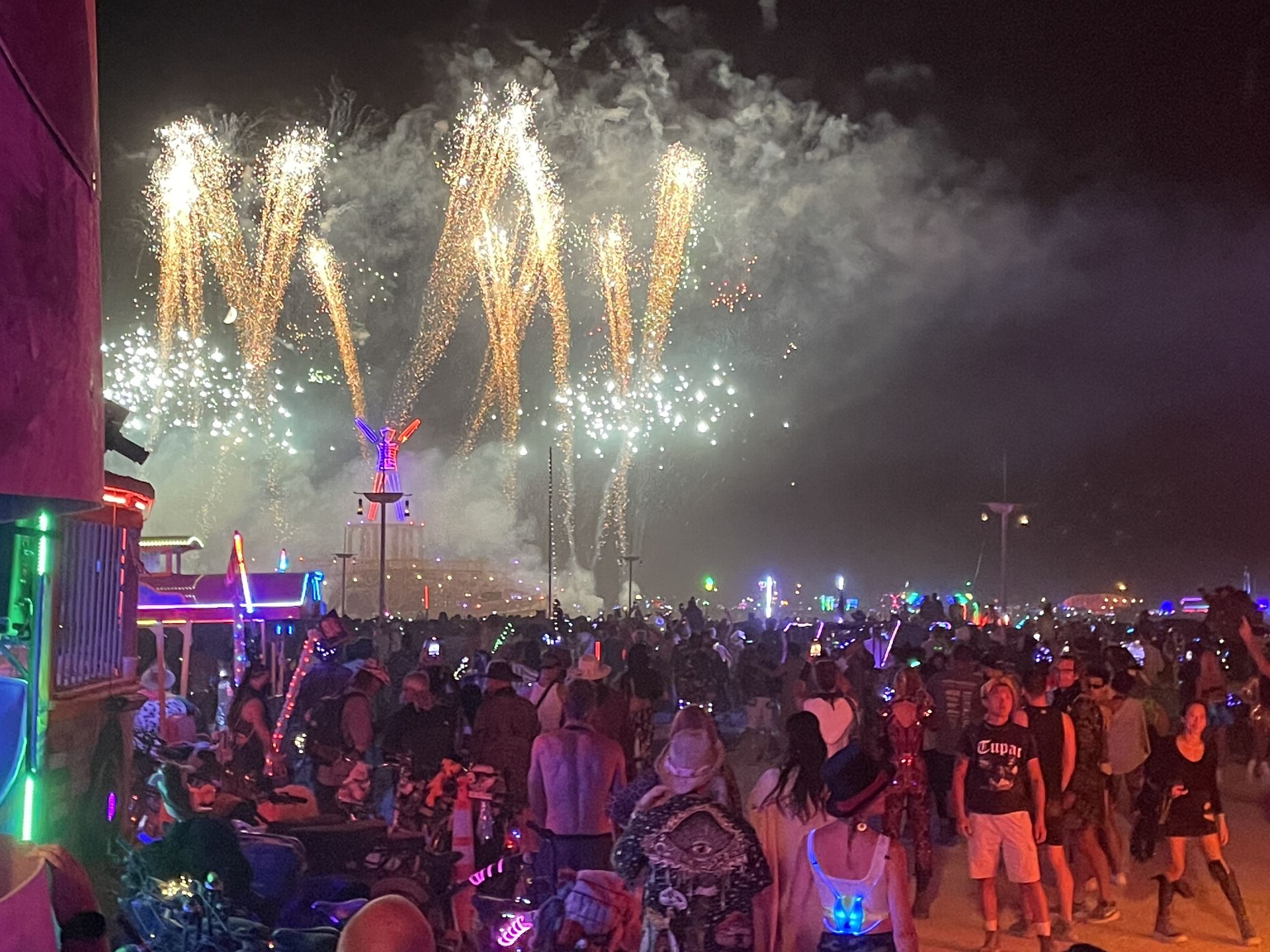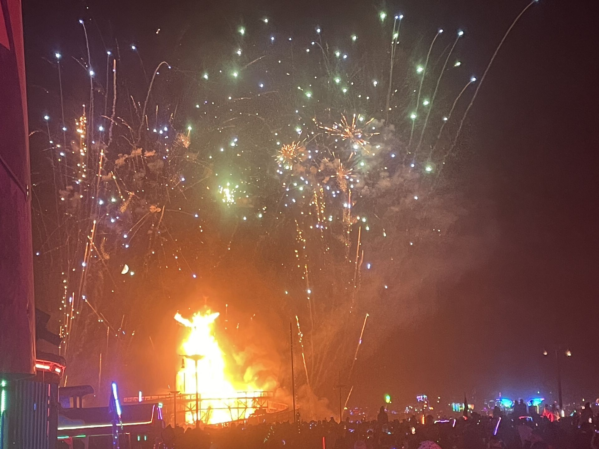 The unforgettable days seem endless, until I suddenly see someone leaving the grounds with their suitcase. Suddenly, I realize we're not living here permanently. How will I get back to Reno? How will I continue my journey? On Saturday, the large wooden man in the center of the grounds is burned, and there's a huge celebration, and on Sunday, the temple is set ablaze, naturally in deathly silence. Because I hitchhiked to Burning Man, I start asking around if anyone happens to have a spot available to take me. The uncertainty that I might have to leave today, or maybe even in two days, is causing me considerable anxiety. Someone from our camp offers me a ride, and we leave Sunday morning, the day after the man's burning. One last time, the entire city gathers for a huge celebration. All the art cars, around 200, form a circle around the man. And then, as it gets dark, the fireworks start and the man is set on fire. The show is indescribably beautiful. How is something like that possible in the middle of the desert? No direction or anyone to announce it; the whole show and the fire start automatically.